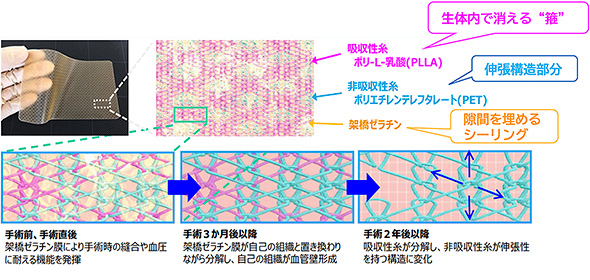 」を開発。患者の組織に置き換わり、成長に追従可能な伸張を有する革新的な製品で、先天性心疾患の手術に既存材料を使用した場合に発生する
