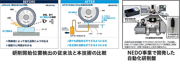 砥石の回転を止めずに研削加工の開始点を自動検出する「高精度エアマイクロセンサ」を開発。従来は熟練者が目や耳で確認していたが、熟練技術者不足や自動化のニーズに対応。