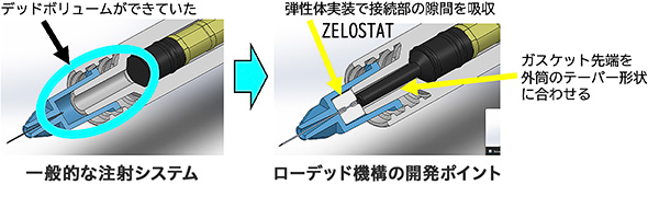 。独自のローデッド機構で注射器を押し込んだ時の空間をなくすことで、